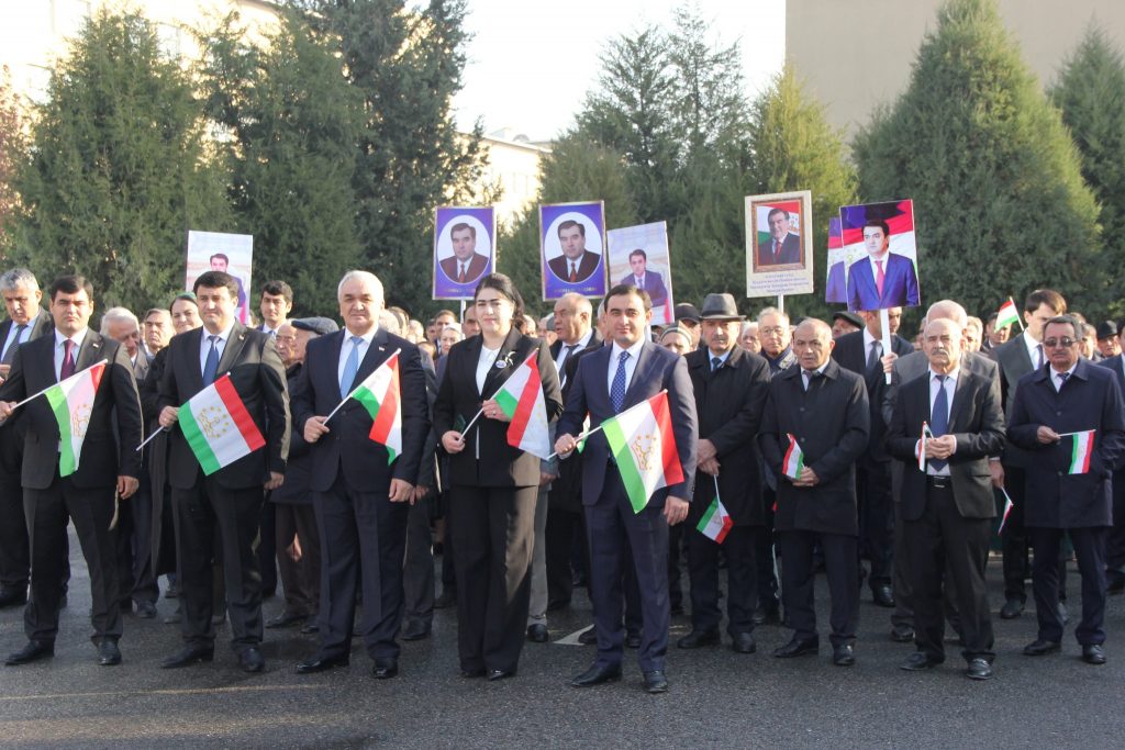 Участники шествия с праздничными и продолжительными криками «Мо бо Пешвои худ ифтихор дорем!», «Шараф ба ҷавонони даврони соҳибистиқлол!», «Парафшон бод, парчами Тоҷикистони азиз!», «Тоҷикистон, ба пеш!», а также с лозунгами и флагами прошли по студенческому городку.