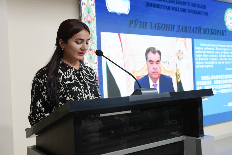 Сипас, директори Донишкада аз ҷониби Тоҷикистон Имомзода Маҳина дар мавзуи Рӯзи забони давлатӣ маърӯза кард. Ӯ бо иқтибос аз суханони Пешвои миллат муҳтарам Эмомалӣ Раҳмон, ба аҳаммияти забони модарӣ дар таҳкими ҳувияти миллӣ ва ваҳдати миллӣ ишора намуда, зарурати ҳифзу рушди забони давлатиро шарҳ дод. Зикр гардид, ки забон ҳамчун падидаи фарҳангӣ аз оғоз то имрӯз барои нигоҳдории таърих, арзишҳои маънавӣ, анъана ва суннатҳои миллӣ хизмат карда, унсури муҳимми бақои миллат ва худшиносии миллӣ маҳсуб меёбад.