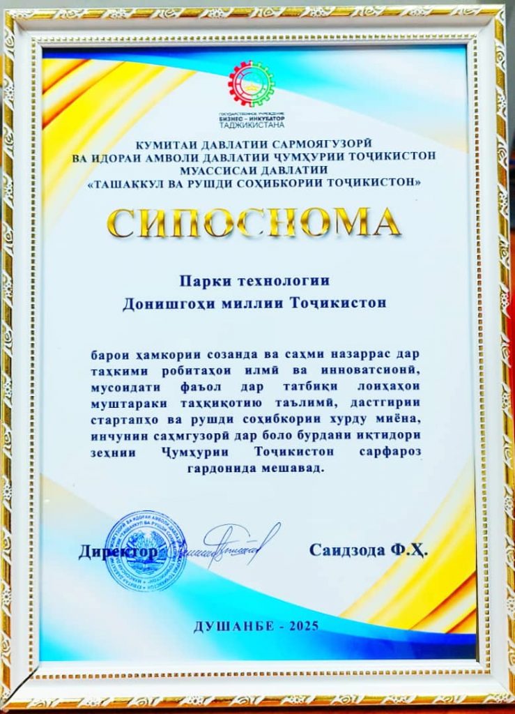 Парки технологии Донишгоҳи миллии Тоҷикистон барои ҳамкории судманд ва саҳми назаррас дар таҳкими робитаҳои илмӣ ва инноватсионӣ, мусоидати фаъол дар татбиқи лоиҳаҳои муштараки таҳқиқотию таълимӣ, дастгирии стартапҳо ва рушди соҳибкории хурду миёна, инчунин, саҳмгузорӣ дар боло бурдани иқтидори зеҳнии Ҷумҳурии Тоҷикистон бо Сипосномаи Кумитаи давлатии сармоягузорӣ ва идораи амволи давлатии Ҷумҳурии Тоҷикистон, “Муассисаи давлатии “Ташаккул ва рушди соҳибкории Тоҷикистон” сарфароз гардонида шуд.