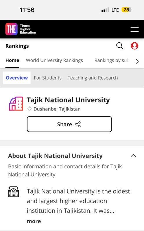 ХУШХАБАР. Донишгоҳи миллии Тоҷикистон ба қатори беҳтарин донишгоҳҳои дунё дар раддабандии Times Higher Education шомил гашт